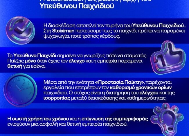 Έτσι, το Responsible Gaming για τη Stoiximan δεν περιορίζεται σε ένα υποχρεωτικό disclaimer στο κάτω μέρος της οθόνης. Συνδέεται με μια σύγχρονη αντίληψη για την ψηφιακή ζωή: ισορροπημένη χρήση, προσωπικά όρια, γνώση του πώς λειτουργεί ο άνθρωπος μπροστά στο παιχνίδι. Με άλλα λόγια, μια υπεύθυνη ψυχαγωγία που ξεπερνά το ίδιο το παιχνίδι και αγγίζει συνολικά τον τρόπο που σχετιζόμαστε με την τεχνολογία.