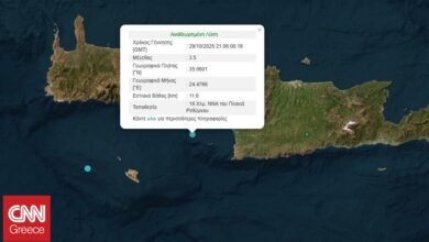 Ασθενής σεισμική δόνηση μεγέθους 3,5 βαθμών της κλίμακας Ρίχτερ έγινε στην Κρήτη την Τετάρτη (29/10). Σύμφωνα με το Γεωδυναμικό το επίκεντρο της…