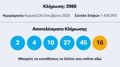 Πραγματοποιήθηκε το βράδυ της Κυριακής (26/10) η κλήρωση 2980 του Τζόκερ που μοιράζει στην πρώτη κατηγορία ένα εκατομμύριο ευρώ. Οι τυχεροί αριθμοί…