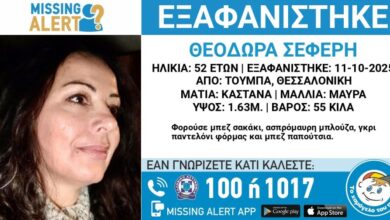 Συναγερμός έχει σημάνει στην περιοχή της Τούμπας στην Θεσσαλονίκη για την εξαφάνιση 52χρονης, η ζωή της οποίας βρίσκεται σε κίνδυνο. Πρόκειται…