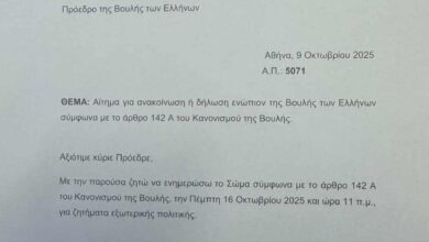 Βουλή: Στις 16 Οκτωβρίου η ενημέρωση από τον πρωθυπουργό για ζητήματα εξωτερικής πολιτικής