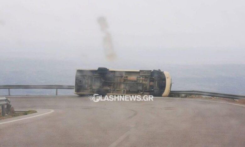 Χανιά: Θυελλώδεις άνεμοι ανέτρεψαν λεωφορείο στη μέση του δρόμου