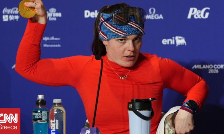 Η Τζόνσον, η οποία κατέκτησε το χρυσό μετάλλιο στο γυναικείο αλπικό σκι κατάβασης, έδειξε το σπασμένο μετάλλιο που κατέκτησε στη συνέντευξη Τύπου μετά την εκδήλωση.