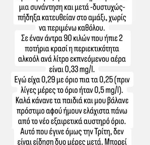 Εγώ είχα 0,29 με όριο πια τα 0,25 (πριν λίγες μέρες το όριο ήταν 0,5 mg/l). Καλά κάνανε τα παιδιά και μου βάλανε πρόστιμο αφού ήμουν ελάχιστα πάνω από το νέο εξαιρετικά αυστηρό όριο. Αυτό που έγινε όμως την Τρίτη δεν είναι είδηση 2 ημέρες μετά. Μπορεί σήμερα κάτι να εξυπηρετεί. Τέλος πάντων, από αύριο μόνο φραπέ», κατέληξε.