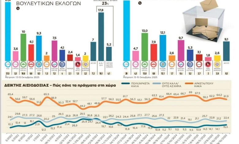 Η Ν.Δ. βρίσκεται πάνω – κάτω στα ποσοστά που ήταν το καλοκαίρι – φθινόπωρο του 2024 και παρατηρείται μια μικρή άνοδος στον δείκτη αισιοδοξίας για το πώς πάνε τα πράγματα στη χώρα, ενώ οι πολίτες αξιολογούν ως κορυφαία προβλήματα την ακρίβεια στα τρόφιμα και τα ενοίκια, αλλά και τα χαμηλά εισοδήματα. Το ΠΑ-ΣΟΚ, που ξαναμπαίνει σε φάση εσωστρέφειας, ύστερα από τους χειρισμούς Ανδρουλάκη σε θέματα όπως ο Αγνωστος Στρατιώτης και η απουσία από την κηδεία του Διονύση Σαββόπουλου, χάνει 0,8 της μονάδας και πέφτει στο 13%.