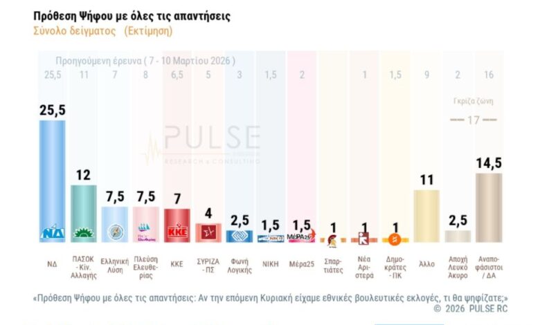 Δημοσκόπηση Pulse: Στο 31% η ΝΔ, 16,5 μονάδες μπροστά από το ΠΑΣΟΚ – Πώς αξιολογούνται τα μέτρα