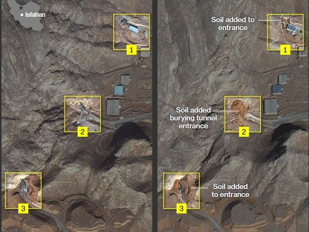 Οι εικόνες δείχνουν ότι πολλαπλές είσοδοι σηράγγων κοντά στο πυρηνικό συγκρότημα του Ισφαχάν έχουν επιχωματωθεί. Σύμφωνα με αναλυτές, η κίνηση αυτή αποσκοπεί στην αποτροπή καταρρεύσεων από αεροπορικά πλήγματα και στη σφράγιση ευάλωτων σημείων που θα μπορούσαν να αποτελέσουν στόχο διατρητικών πυρομαχικών.