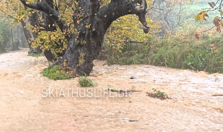 Ισχυρή βροχόπτωση έχει σημειωθεί στη Σκιάθο, προκαλώντας σοβαρά προβλήματα στο οδικό δίκτυο του νησιού.
