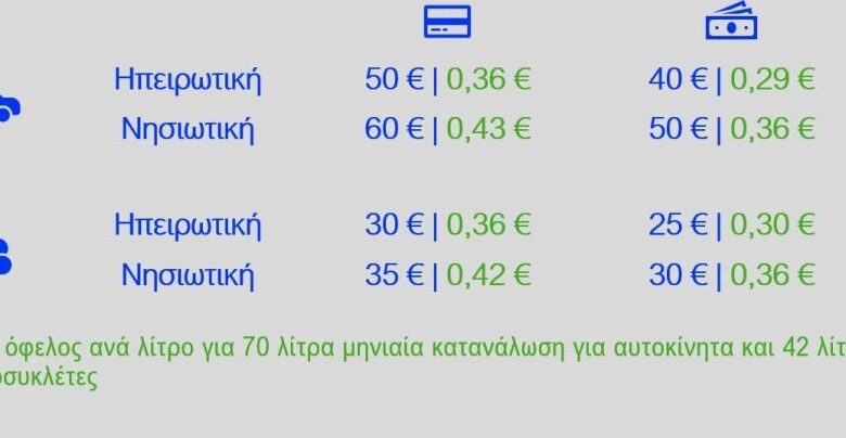 Για ιδιοκτήτες μοτοσυκλετών η επιδότηση ανέρχεται σε 30 ευρώ (25 ευρώ χωρίς κάρτα) σε ηπειρωτική και 35 ευρώ (30 ευρώ χωρίς κάρτα) σε νησιωτική περιοχή.