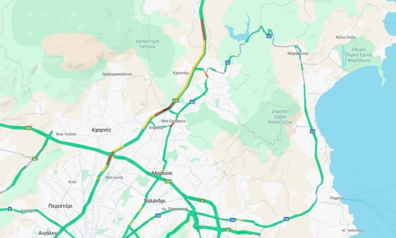 Από το απόγευμα με ελαφρώς χαμηλές ταχύτητες κινούνταν τα οχήματα στην Εθνική Αθηνών – Λαμίας στο ύψος των διοδίων των Αφιδνών μέχρι τη Νέα Φιλαδέλφεια στο ρεύμα προς Πειραιά.