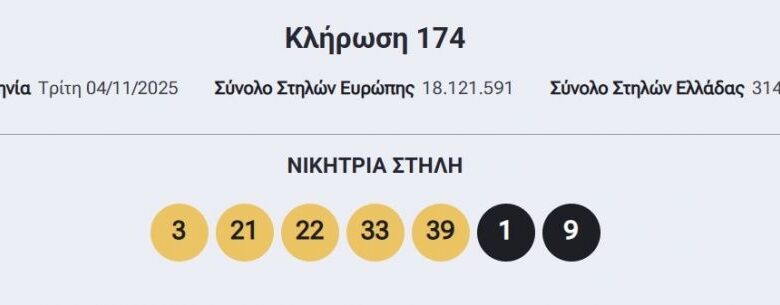 Οι τυχεροί αριθμοί, που ανέδειξε η κληρωτίδα της αποψινής κλήρωσης, είναι οι εξής: 3, 21, 22, 33, 39 και αριθμοί Eurojackpot 1 και 9.