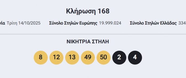 Πραγματοποιήθηκε η σημερινή (14/10) κλήρωση 168 του Eurojackpot, το οποίο μοιράζει το ποσό των 56 εκατομμυρίων ευρώ και οι αριθμοί που κερδίζουν είναι οι: 8, 12, 13, 49, 50. Τζόκερ οι αριθμοί: 2 και 4.