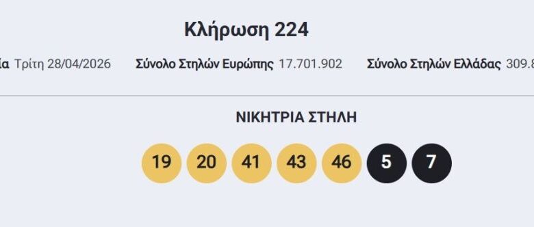 Πραγματοποιήθηκε η σημερινή (28/4) κλήρωση 224 του Eurojackpot που μοιράζει 45 εκατομμύρια ευρώ