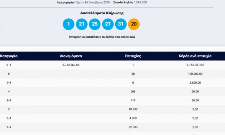 Οι τυχεροί αριθμοί της αποψινής κλήρωσης είναι οι εξής: 1, 21, 25, 27, 31 και Τζόκερ ο αριθμός 20.