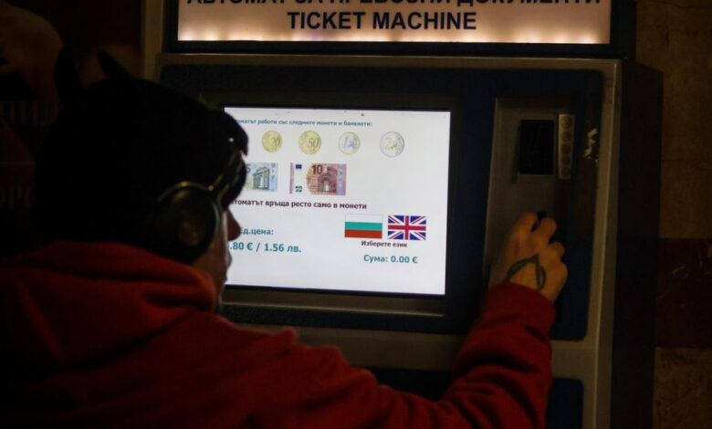 Ένα άτομο αγοράζει εισιτήρια από ένα μηχάνημα που υποδεικνύει ποια χαρτονομίσματα και κέρματα ευρώ γίνονται δεκτά