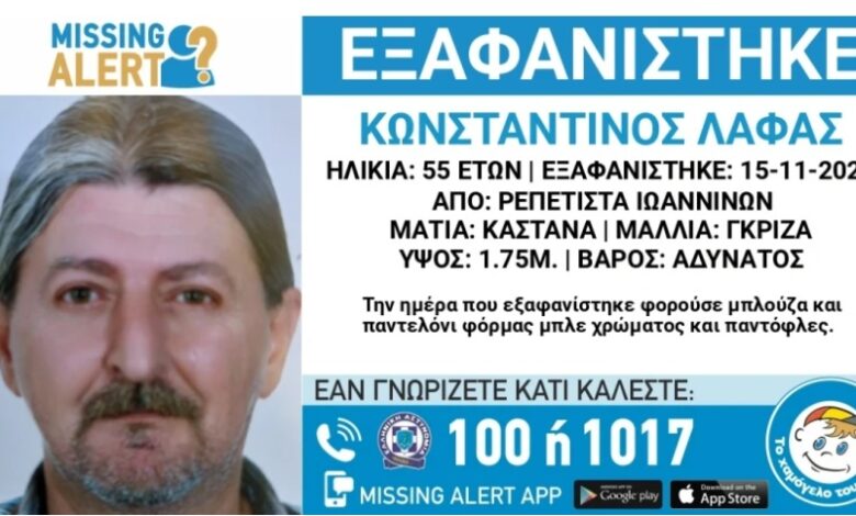 Ιωάννινα: Συναγερμός για εξαφάνιση 55χρονου – Σε πιθανό κίνδυνο η ζωή του
