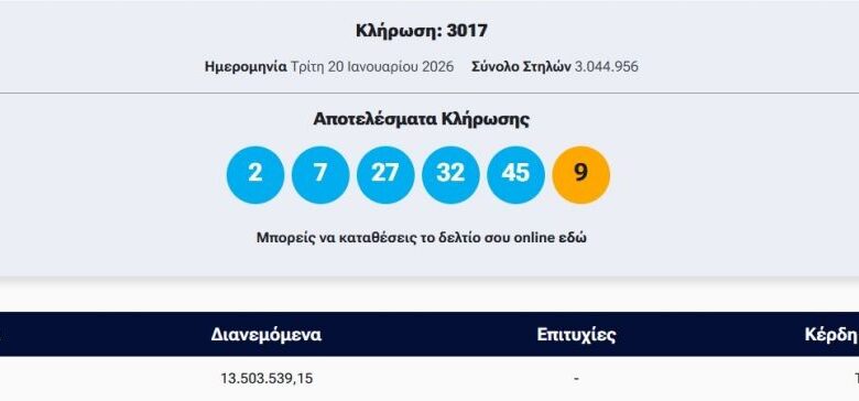 Πραγματοποιήθηκε το βράδυ της Τρίτης (20/1) η κλήρωση 3017 του Τζόκερ που μοιράζει στην πρώτη κατηγορία 13.500.000 ευρώ.