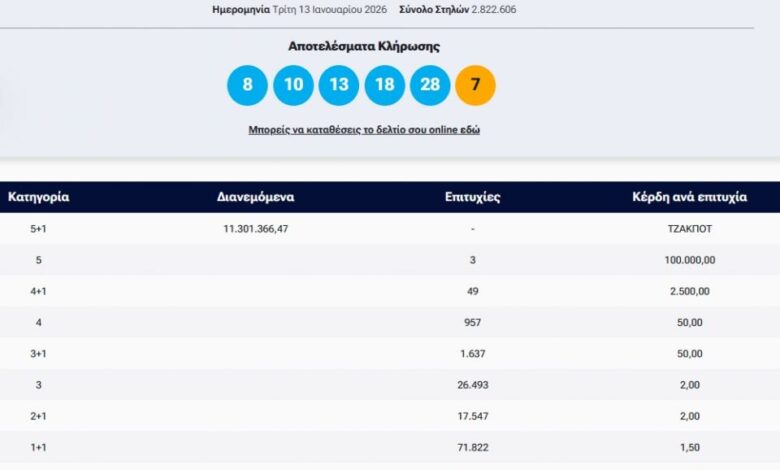 Οι τυχεροί αριθμοί της αποψινής κλήρωσης είναι οι εξής: 8, 10, 13, 18, 28 και αριθμός Τζόκερ το 7.