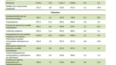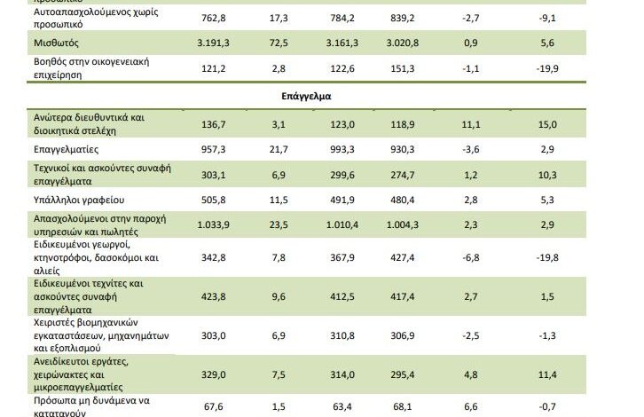 Σε σχέση με το αντίστοιχο τρίμηνο του προηγούμενου έτους, η μεγαλύτερη αύξηση παρατηρείται επίσης στα ανώτερα διευθυντικά και διοικητικά στελέχη (15,0%) και η μεγαλύτερη μείωση στους ειδικευμένους γεωργούς, κτηνοτρόφους, δασοκόμους και αλιείς (-19,8%).