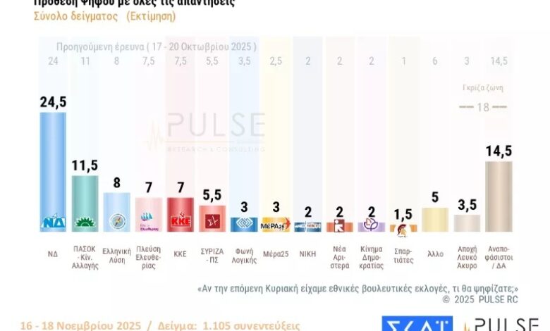 Στάσιμα παραμένουν τα ποσοστά του ΠΑΣΟΚ και του ΚΚΕ, ενώ ταυτόχρονα επιβεβαιώνεται η κάμψη του ΣΥΡΙΖΑ.