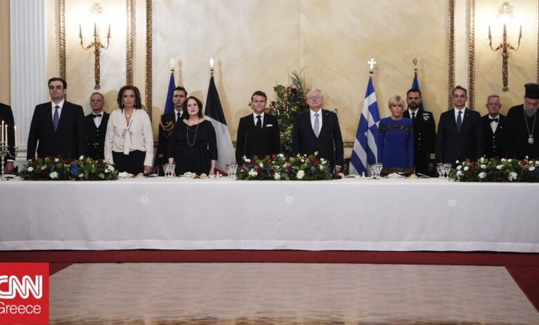 Αμέσως μετά τη συζήτηση στη Ρωμαϊκή Αγορά, ο Πρόεδρος της Δημοκρατίας Κώστας Τασούλας πήρε τη σκυτάλη από τον Κυριάκο Μητσοτάκη και υποδέχτηκε τον Γάλλο ομόλογό του στο Προεδρικό Μέγαρο. Ο Γάλλος ηγέτης μετέβη εκεί με τη σύζυγό του, Μπριζίτ, όπου και ήταν επίσημοι προσκεκλημένοι του δείπνου.