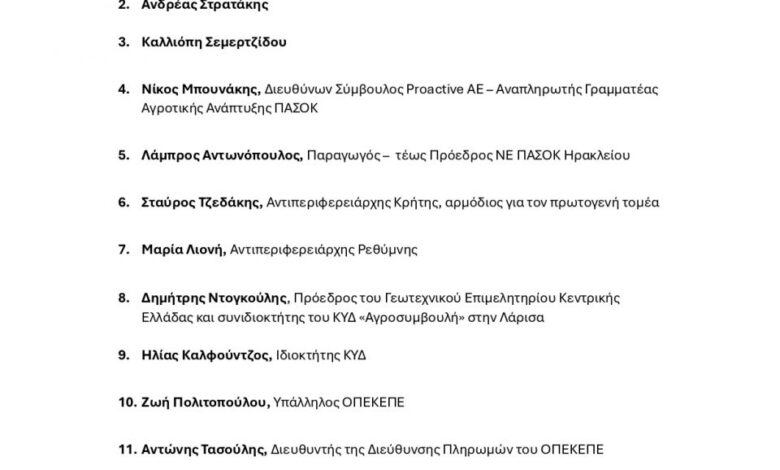Επίσης, από το ΠΑΣΟΚ καλεί τον Νίκο Μπουνάκη, διευθύνοντα σύμβουλο της Proactive AE και αναπληρωτή γραμματέα Αγροτικής Ανάπτυξης του ΠΑΣΟΚ.