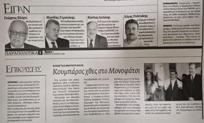 Προς επίρρωση, μάλιστα, του ισχυρισμού του, ο πρόεδρος του ΠΑΣΟΚ κατέθεσε στη Βουλή δημοσίευμα εφημερίδας, σύμφωνα με το οποίο ο Κωνσταντίνος Μητσοτάκης είχε παντρέψει τον Μανόλη Ξυλούρη.
