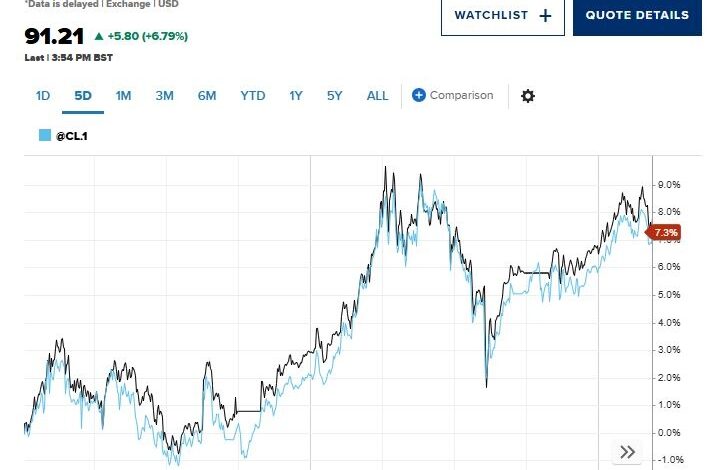 Την ίδια ώρα, τα συμβόλαια μελλοντικής εκπλήρωσης αργού πετρελαίου West Texas Intermediate των ΗΠΑ κυμαίνονταν 8,76% υψηλότερα στα 88,11 δολάρια.