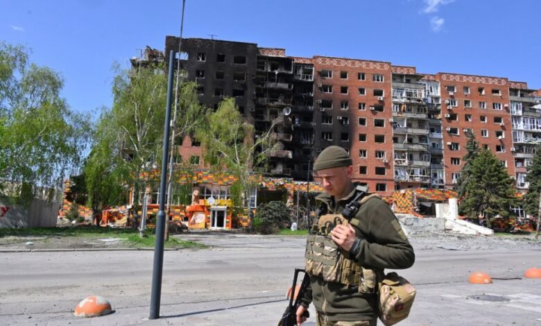 Ουκρανός στρατιώτης περπατάει δίπλα από κατεστραμμένα κτήρια στο Ποκρόφσκ