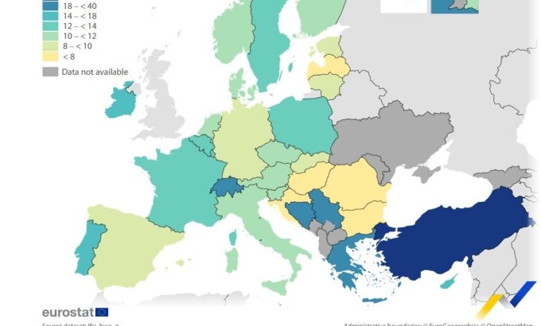 Ακολουθούν η Κύπρος (16,6%) και η Μάλτα (14,6%), ενώ στα χαμηλότερα επίπεδα βρίσκονται η Βουλγαρία (2,5%), η Λετονία (4,1%) και η Ρουμανία (5,9%).