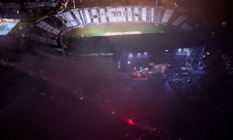 Πανοραμική άποψη του σταδίου της Τούμπας με την πομπή οχημάτων για τους νεκρούς φίλους του ΠΑΟΚ