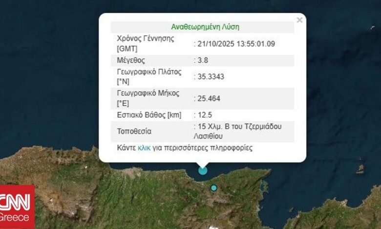 Σεισμική δόνηση μεγέθους 3,8 Ρίχτερ σημειώθηκε το μεσημέρι της Τρίτης (21/10) στα ανοιχτά του Λασιθίου στην Κρήτη.