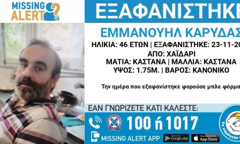 Συναγερμός έχει σημάνει για την εξαφάνιση το μεσημέρι της Κυριακής 23/11, του Εμμανουήλ Καρύδα, 46 ετών από την περιοχή του Χαϊδαρίου στην Αθήνα.