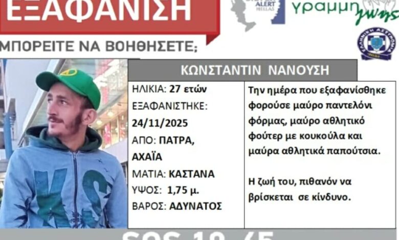 Σύμφωνα με ανακοίνωση της «Γραμμής Ζωής» που εξέδωσε Silver Alert πρόκειται για τον Κωνσταντίν Νανούση, 27 ετών, που εξαφανίστηκε στην περιοχή του Καταστήματος Κράτησης Πατρών, στην Πάτρα, το απόγευμα της 24/11/25.