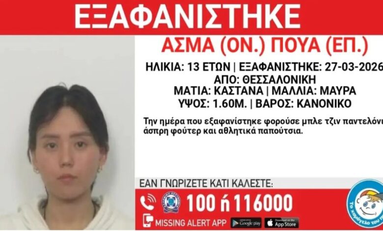 Σε ανακοίνωσή του το «Χαμόγελο του Παιδιού» αναφέρει ότι τα ίχνη της 13χρονης Άσμα Πούα χάθηκαν στις 27 Μαρτίου, απογευματινές ώρες από την περιοχή της Θεσσαλονίκης.