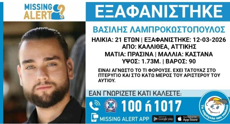 Σύμφωνα με την ανακοίνωση του «Χαμόγελου του Παιδιού», στις 12 Μαρτίου 2026, εξαφανίστηκε από την περιοχή της Καλλιθέας, Αττικής ο Βασίλης Λαμπροκωστόπουλος, 21 ετών.