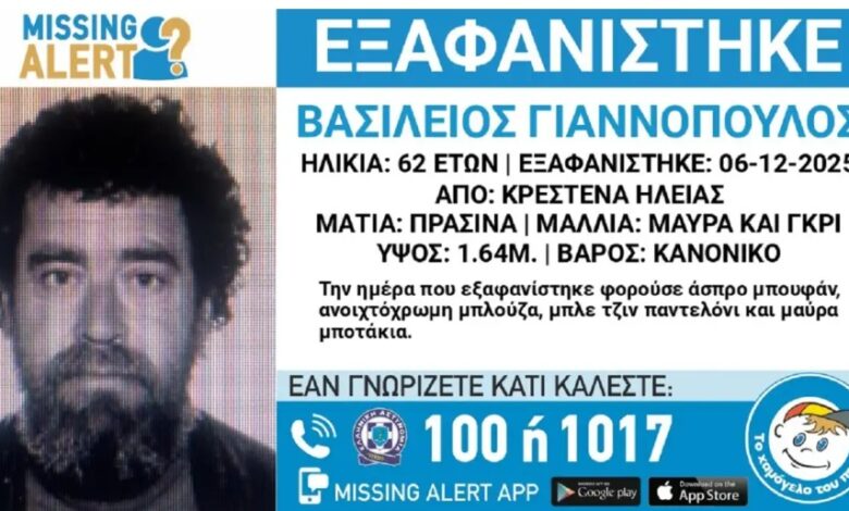 Συναγερμός για την εξαφάνιση 62χρονου από τα Κρέστενα Ηλείας
