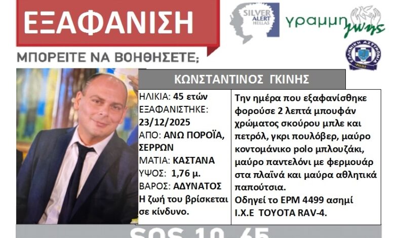 Για την εξαφάνιση του 45χρονου έχει εκδοθεί Silver Alert, με τις αρχές να καλούν όποιον έχει πληροφορίες να επικοινωνήσει άμεσα.