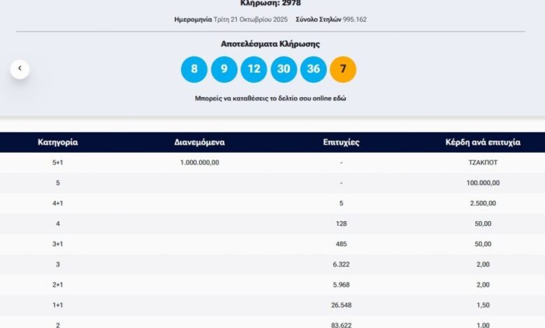 Πραγματοποιήθηκε το βράδυ της Πέμπτης (23/10) η κλήρωση 2978 του Τζόκερ που μοιράζει στην πρώτη κατηγορία ένα εκατομμύριο ευρώ.