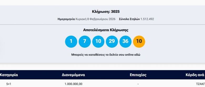 Πραγματοποιήθηκε το βράδυ της Κυριακής (8/2) η κλήρωση 3025 του Τζόκερ που μοιράζει στην πρώτη κατηγορία τουλάχιστον 1.000.000 ευρώ.